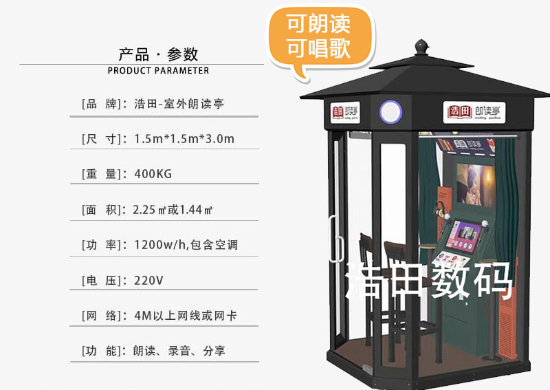 朗讀亭伴隨著央視中央電視臺開年力作,大型文化情感節(jié)目《朗讀者》的籌劃應(yīng)運而生、朗讀亭外觀古樸、比普通的電話亭要稍微略大一些,上面寫著大大的“朗讀亭”字樣,24小時開放。內(nèi)部工作臺、電源、燈飾、插座及一套完整的錄音設(shè)備。廣州浩田為客戶提供室外朗讀亭加盟渠道,為您解答朗讀亭價格費用、朗讀亭免費使用嗎、室外朗讀亭怎么使用等問題。