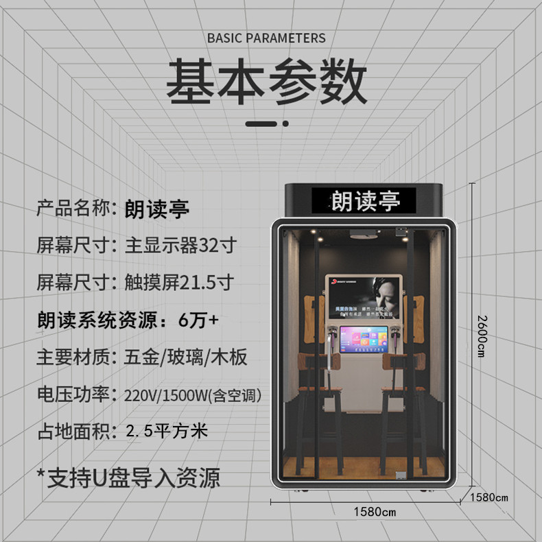 產品特點:大型室內朗讀亭尺寸158*158*266cm,可容納2~4人,專業用于:學校、圖書館、部隊、企業、單位等地方。朗讀+唱歌雙系統隨意切換,可U盤導入曲庫,后期免費更新朗讀素材以及歌曲,外觀裝有LED燈條,彰顯高端大氣,放置話筒的位置暖心設計了紫外線燈光系統。