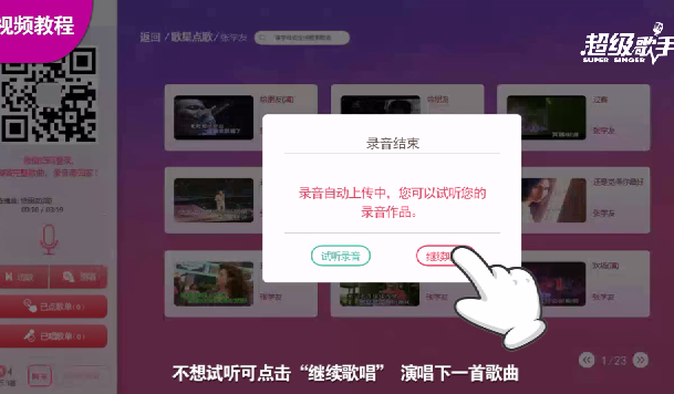 4錄音只有一次機(jī)會,當(dāng)你演唱完后,歌曲自動上傳服務(wù)器上,當(dāng)中,你可以試聽錄音效果,也可以點(diǎn)擊繼續(xù)唱歌。