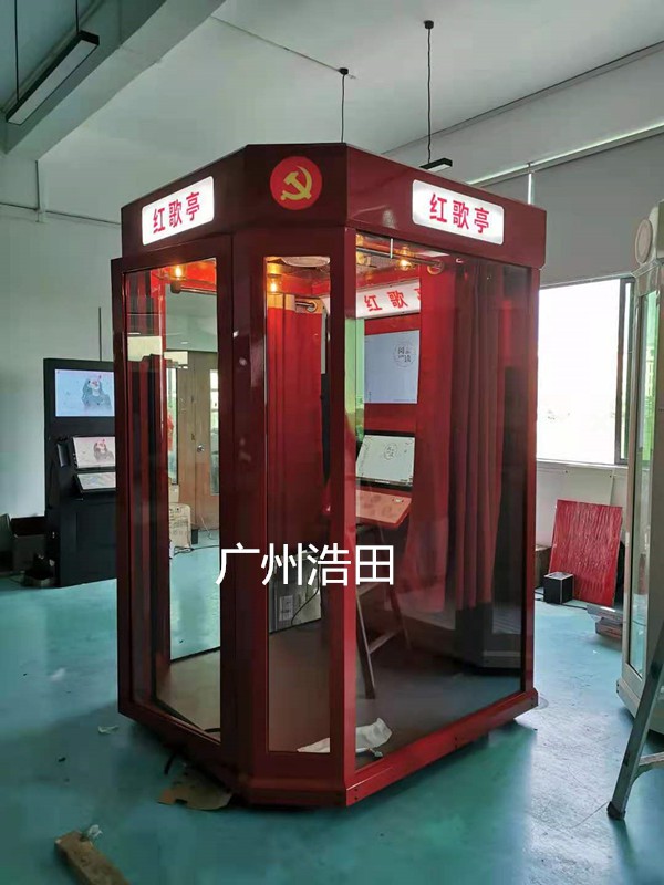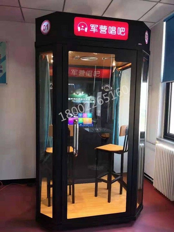 共享自助唱歌機軍營戰友娛樂唱吧亭練歌房迷你KTV廠家定制。軍營唱吧圍繞部隊思想政治教育展開,將思想性、娛樂性、藝術性融為一體,把娛樂向教育滲透,展現了軍隊文化器材的獨特魅力。