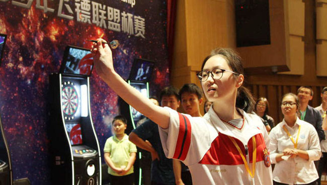 訓練場上,57中一名女生右腿略彎支撐身體,橫向站立,側身、瞄準、擲鏢,投中,順暢地完成了這一系列動作。接著第二次,第三次…… 在這間教室內,78電子飛鏢機,每個鏢靶都已經插滿了針眼,可想訓練之艱苦。這門選修一直吸引了很多學生參加,但是只有基礎的學生,練習成績過關的學生,才能成為學校運動隊一員,代表學校參加比賽。或許不久將來,在國內外飛鏢比賽賽場上,會更多一些天賦爆棚的新生代選手。