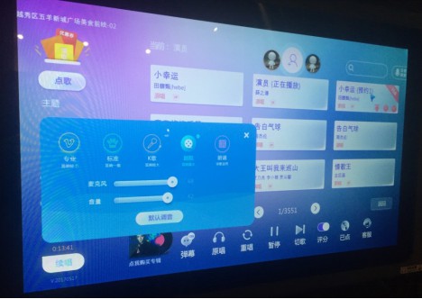一般例如友唱、哇屋的效果音與傳統(tǒng)KTV麥克風(fēng)音效選擇并無二致,基本是回聲的效果,不是專業(yè)的混響效果音,并且回聲效果音時間很長。呈現(xiàn)方式沿用了傳統(tǒng)的觸屏式調(diào)音,專業(yè)、標準、K歌、劇院,這四種分別代表混響較小、混響一般、混響較大、混響最大。劇院混響效果最明顯,但因為延時時間長,有些影響聲音的清晰度,聽到的聲音會比較悶,而且唱歌時如果聲音比較大,地板會有振動的感覺。